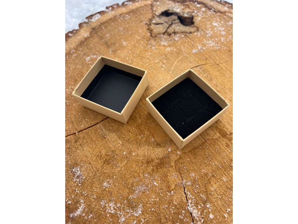 Uvnitř se nachází měkký černý polštářek, který krásně zvýrazní třpyt prstýnku a zajistí jeho bezpečné uložení. Kontrast přírodní hnědé vnější části a černého vnitřku dodává krabičce luxusní vzhled.