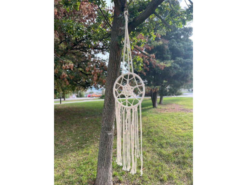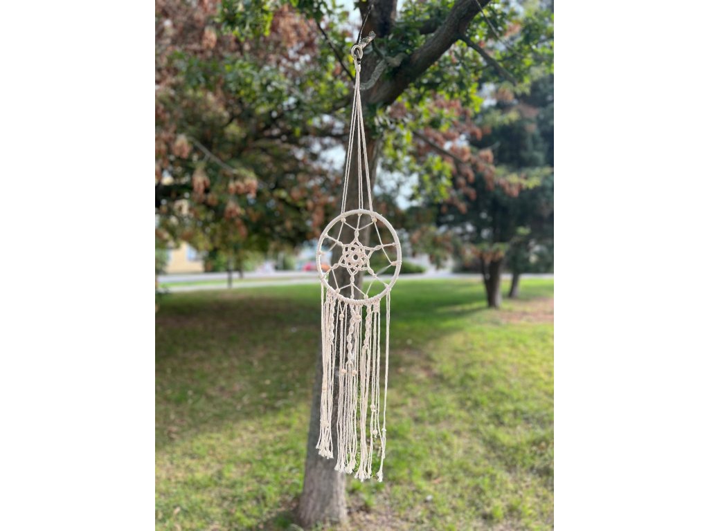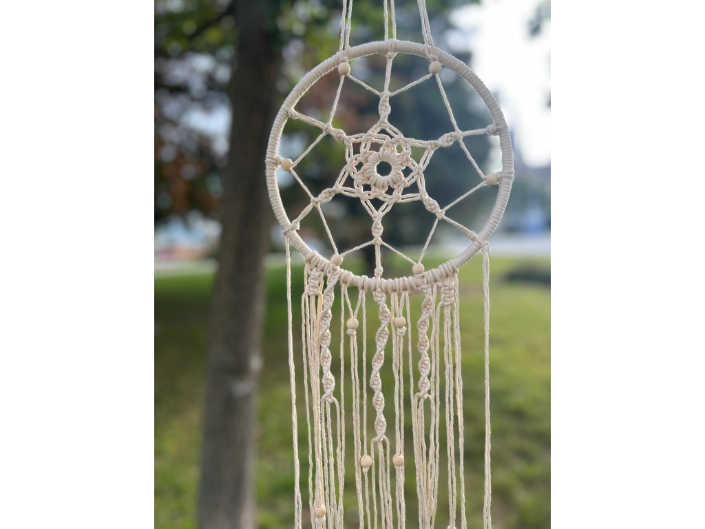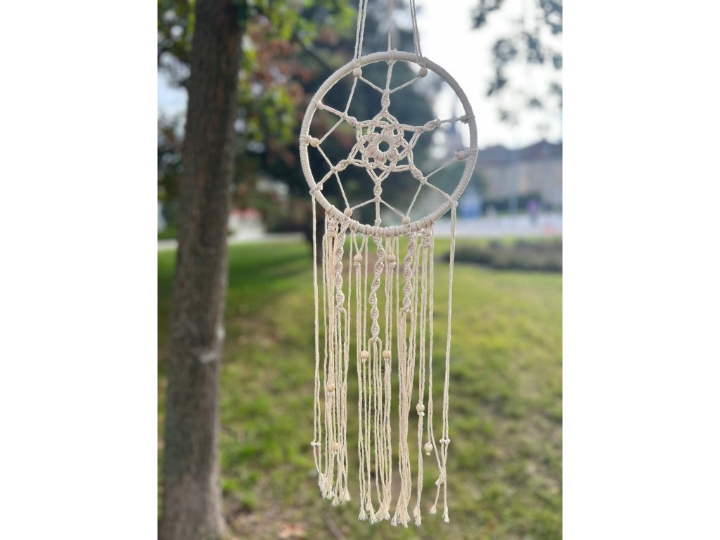 Tento ručně drhaný lapač snů v přírodním tónu přináší nejen krásný dekorativní prvek, ale i symbol ochrany a klidného spánku. Vyrobený z kvalitní bavlněné příze a doplněný o dřevěné korálky, působí jemně, vzdušně a přirozeně.