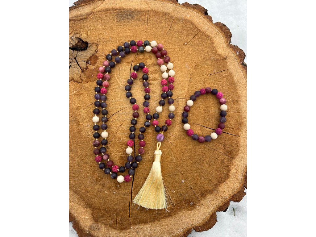 Tento set Mala korálků s náramkem je vytvořen z pečlivě vybraných přírodních kamenů, které společně podporují klid mysli, vnitřní rovnováhu a uzemnění. Nadčasový design propojuje duchovní význam s elegantním vzhledem, takže je vhodný jak pro meditaci, tak pro každodenní nošení.
