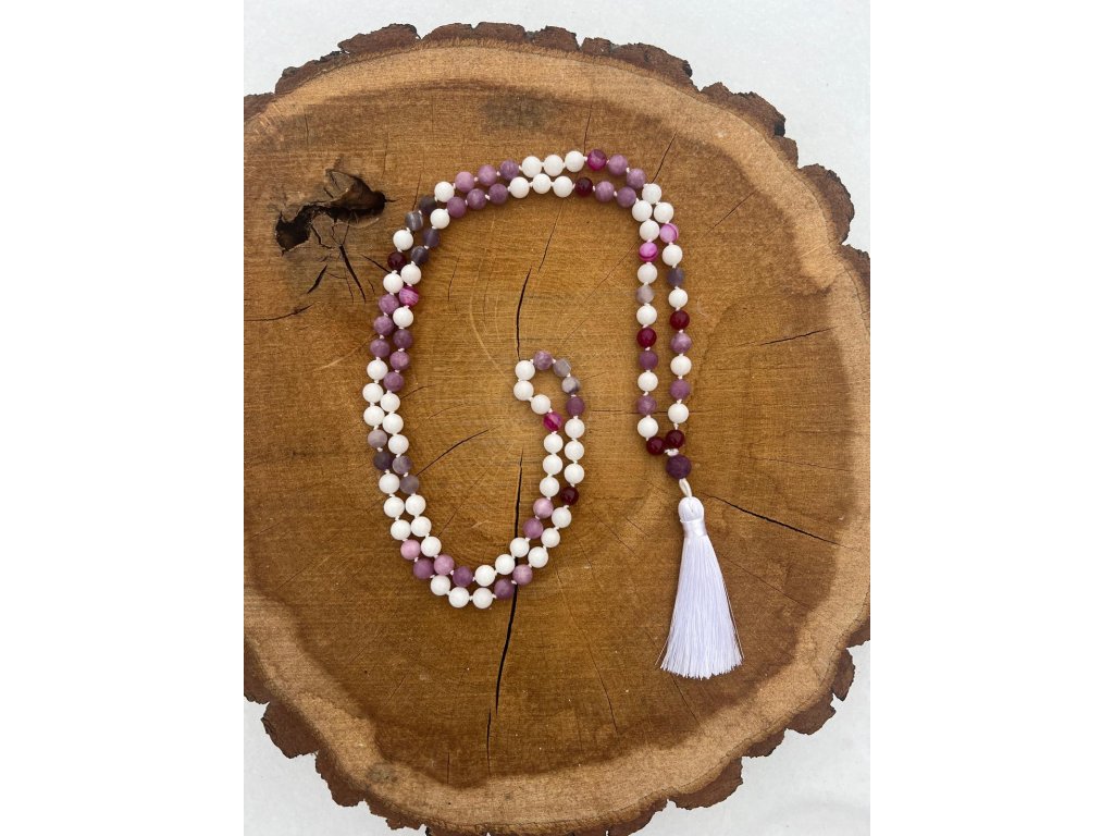 Korálky Mala ze vzácných kamenů spojují tradiční symboliku, přírodní eleganci a energii minerálů. Každý kámen je ručně vybrán pro svou kvalitu, barvu a vibrační vlastnosti. Mala je ideální pro meditaci, afirmace, jako talisman nebo jako výrazný módní doplněk.
