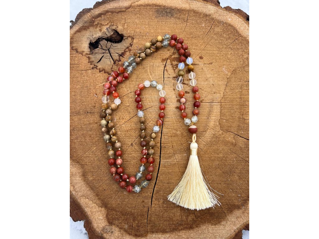 Korálky Mala ze vzácných kamenů propojují tradiční symboliku s přírodní energií minerálů. Kombinace Jaspisu, Tygřího oka a Achátu podporuje sílu, odvahu, prosperitu a harmonii. Mala je vhodná pro meditaci, afirmace nebo jako osobní talisman se silným významem.