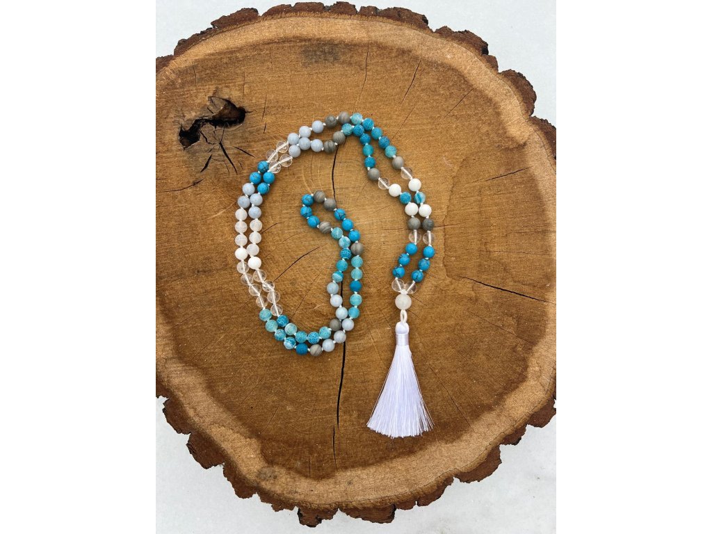 Korálky Mala ze vzácných kamenů spojují symboliku tradiční duchovní praxe s krásou přírodních minerálů. Kombinace Tyrkysu, Křišťálu, Jadeitu a Jaspisu podporuje ochranu, rovnováhu, jasnost mysli i životní sílu. Mala je vhodná pro meditaci, afirmace či jako osobní talisman.