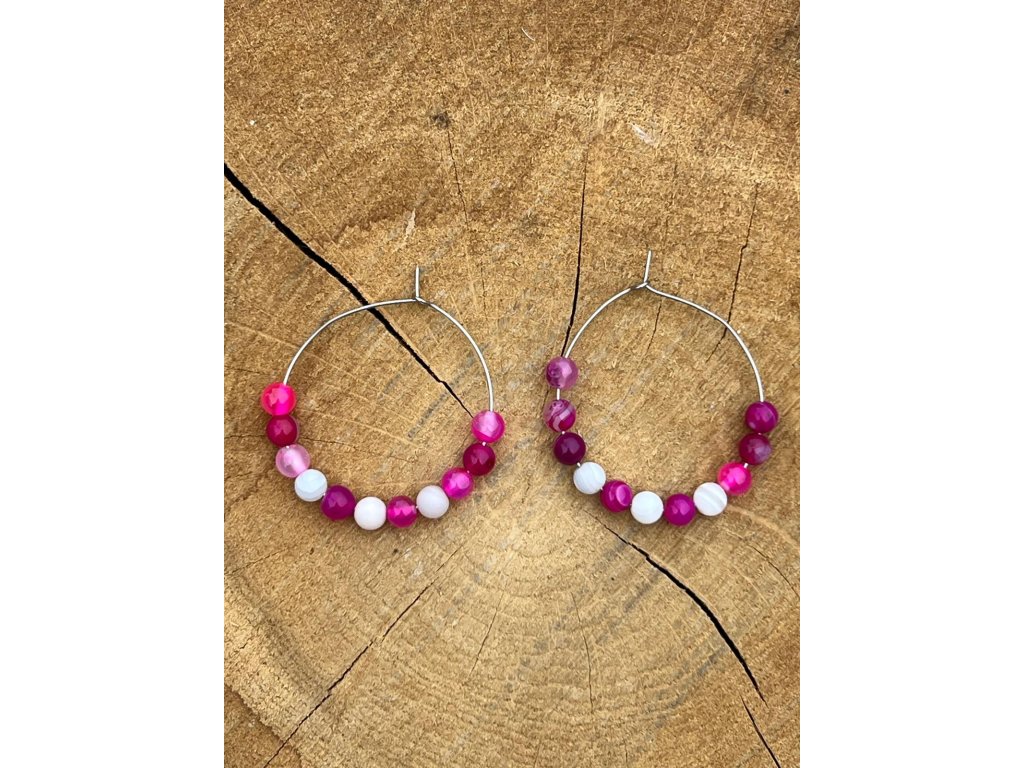 Ručně vyráběné kruhové náušnice ze šperkařského drátu doplněné o přírodní kameny achát pruhovaný a achát matný. Jemná kombinace dvou variant stejného minerálu vytváří vyvážený kontrast struktury, barvy a energie.