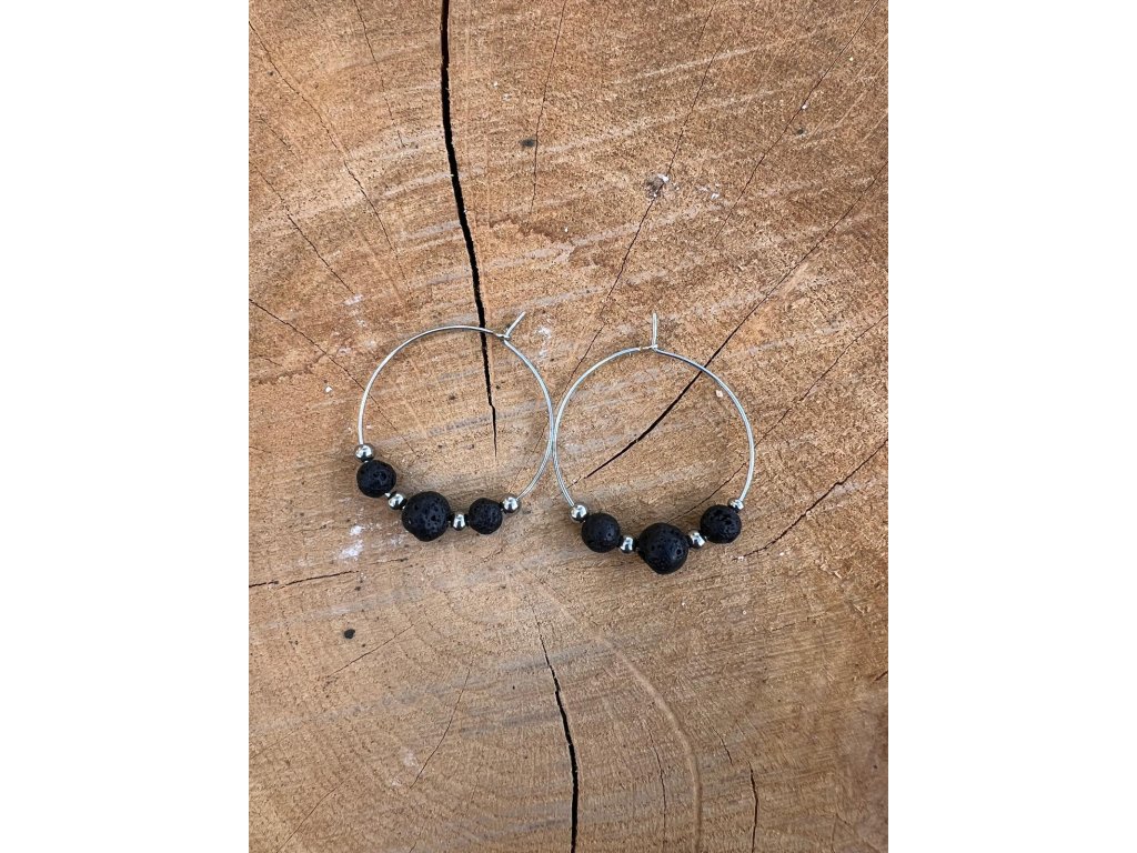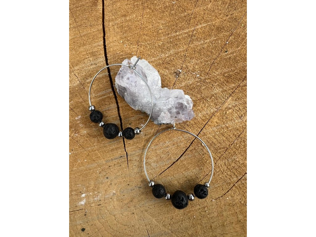 Stylové kruhové náušnice z chirurgické oceli s korálky z černé lávy. Lehký design, přírodní energie a možnost použití s esenciálními oleji.