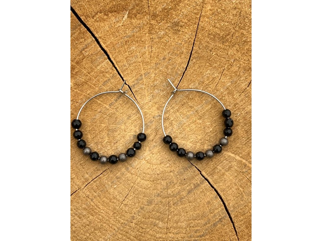 Ručně vyráběné kruhové náušnice ze šperkařského drátu, doplněné o onyx a mosazný korálek. Kombinace hluboké černé onyxu a teplého zlatavého lesku mosazi působí elegantně, vyváženě a tajemně.