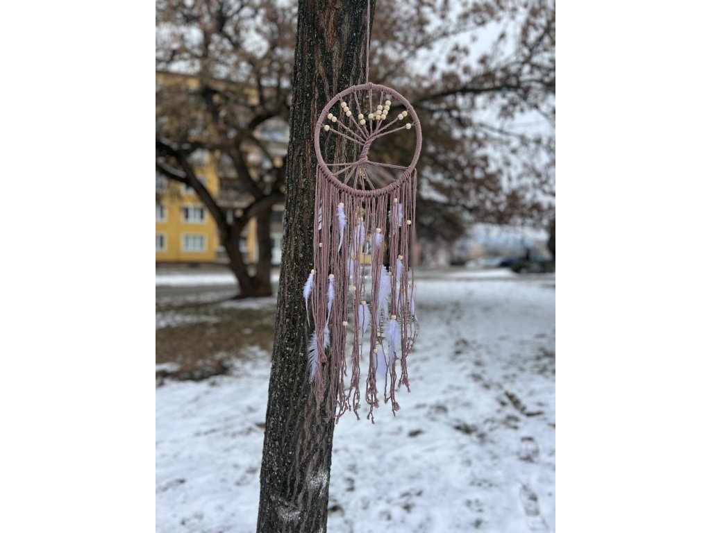 Tento ručně vyráběný lapač snů přináší do prostoru nejen vizuální krásu, ale i symboliku ochrany a klidného spánku. Je tvořen pevně vázanou kruhovou sítí se stromem života, doplněn o dřevěné korálky a jemné umělé peří v přírodních tónech.