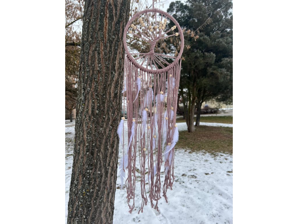 Ručně vyráběný lapač snů s jemným umělým peřím a dřevěnými korálky. Elegantní dekorace do interiéru nebo jako dárek pro klidný spánek.