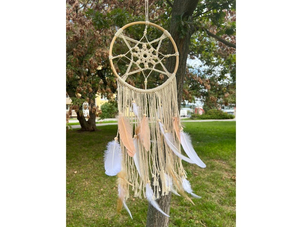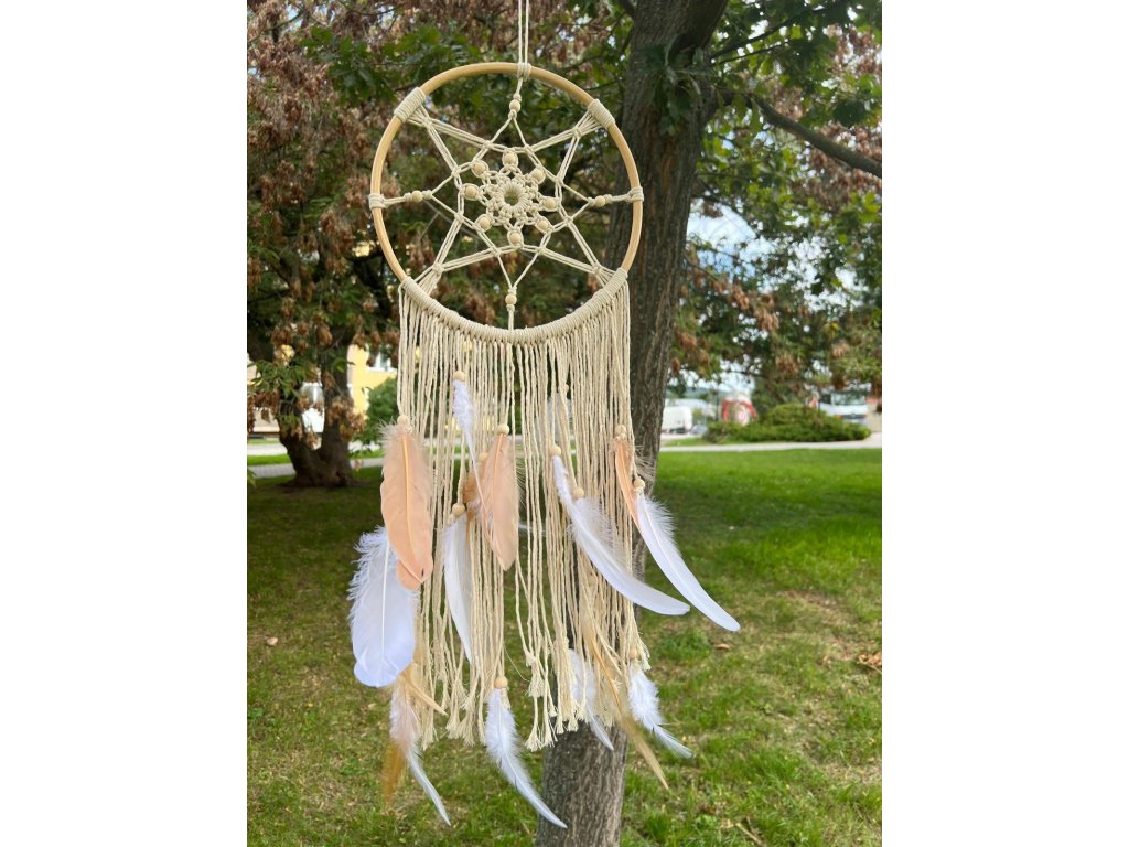 Tento elegantní lapač snů je ručně vyráběný a přináší do vašeho prostoru klid a krásu. S jemnými odstíny béžové a bílou barvou peří, doplněný dřevěnými korálky a kvalitní makramé technikou, tento lapač snů okouzlí svou jednoduchostí a přírodním vzhledem. V horní části je pevně uchycený bambusový kruh, ve kterém je vytvořena síť s unikátním designem, který zachytí negativní energie a umožní vám mít klidný spánek. Visící peří přináší do lapače pohyb a lehkost, což mu dává živý a dynamický charakter. Tento ručně vyráběný kousek je skvělý jako dekorace pro váš domov, ale také jako dar pro ty, kteří hledají symbol ochrany a pozitivní energie.