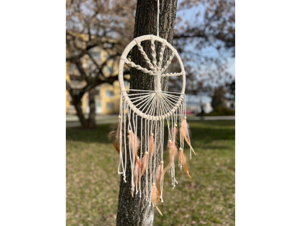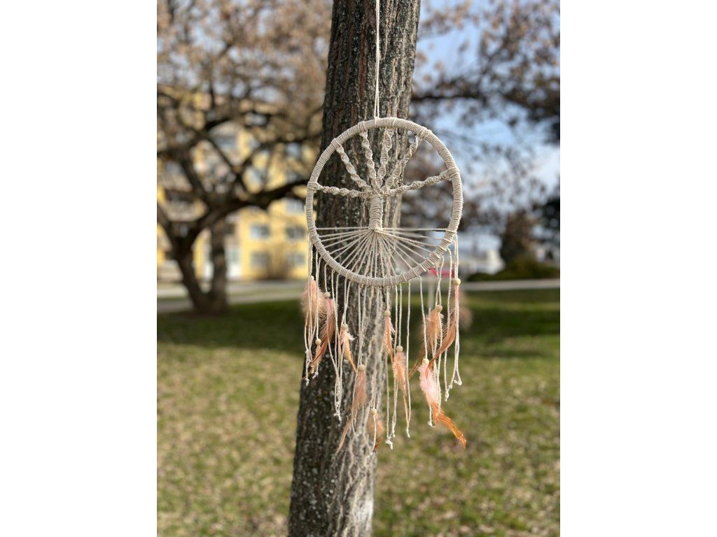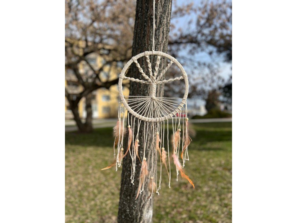 Tento elegantní lapač snů je ručně vyráběný a přináší do vašeho prostoru klid a krásu. S jemnými odstíny béžové a bílou barvou peří, doplněný dřevěnými korálky a kvalitní macramé technikou, tento lapač snů okouzlí svou jednoduchostí a přírodním vzhledem. V horní části je pevně uchycený bambusový kruh, ve kterém je vytvořena síť s unikátním designem stromu, který zachytí negativní energie a umožní vám mít klidný spánek. Visící peří přináší do lapače pohyb a lehkost, což mu dává živý a dynamický charakter. Tento ručně vyráběný kousek je skvělý jako dekorace pro váš domov, ale také jako dar pro ty, kteří hledají symbol ochrany a pozitivní energie.