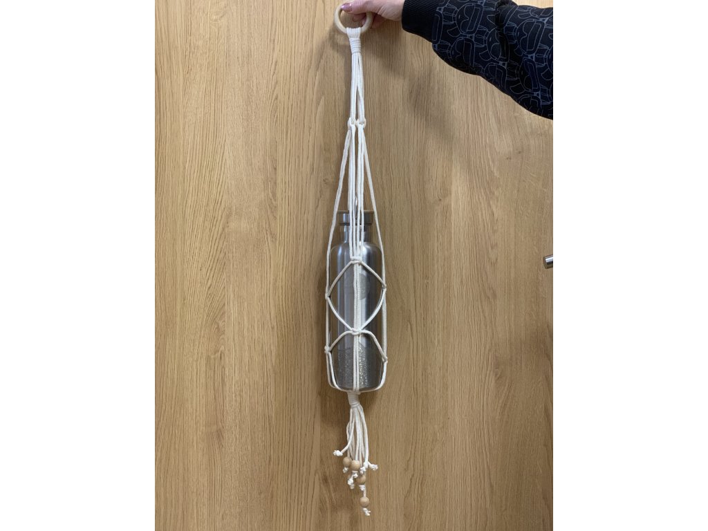 Praktický ručně pletený makramé držák na lahev s dřevěnými korálky a závěsným kroužkem. Stylový doplněk pro cestování, výlety i každodenní použití.