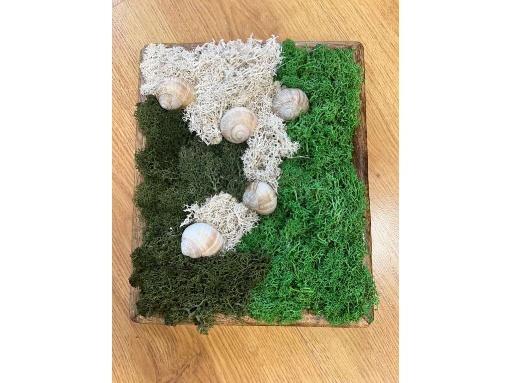 Tento jedinečný mechový obraz je spojením přírodních prvků, které v sobě nesou klid, harmonii a krásu nedotčené přírody. Zelený stabilizovaný mech tvoří základ této kompozice a přináší do prostoru svěží, uklidňující energii lesa. Organicky je doplněn o drobné ulity, které jako poklady vnášejí do obrazu lehký nádech země.