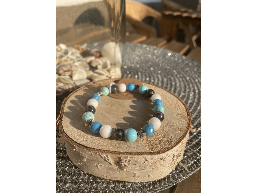 Náramek z tyrkysu, tyrkenitu, labradoritu a jadeitu.