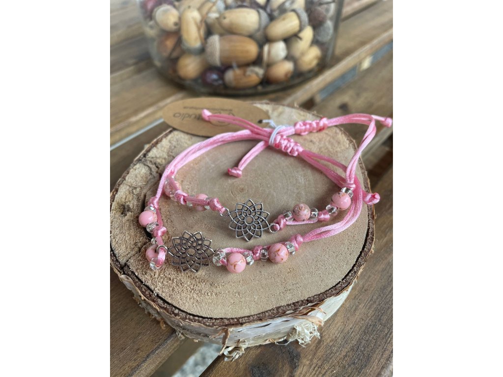 Jemný náramek na růžovém provázku s dekorací a perletí růžovou.