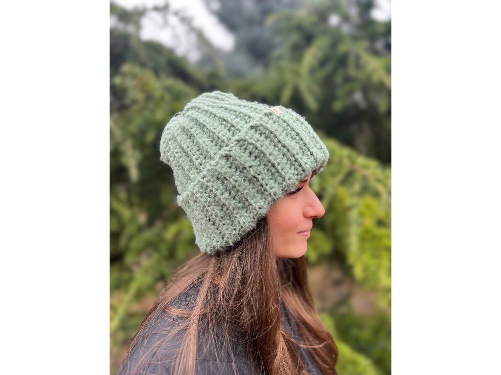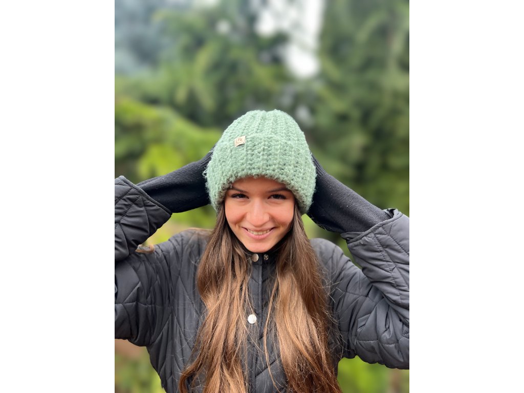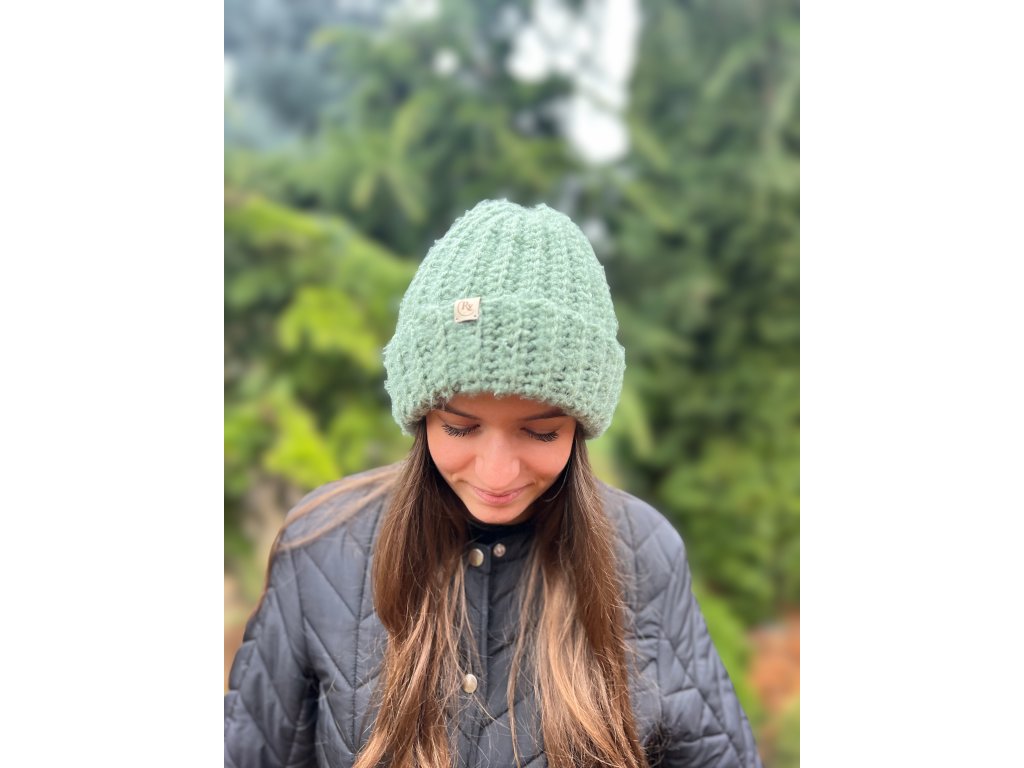 Ručně háčkovaná zelená-mátová čepice – 25 % vlna, 75 % akryl