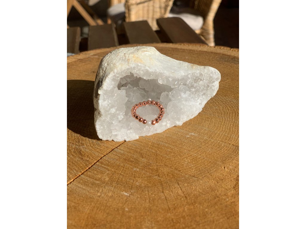 Ručně vyrobený prstýnek ve velikosti 53, složený z drobných hematitových korálků v módním odstínu rose gold, doplněný o decentní perličku, která šperku dodává jemnost a vyváženost.