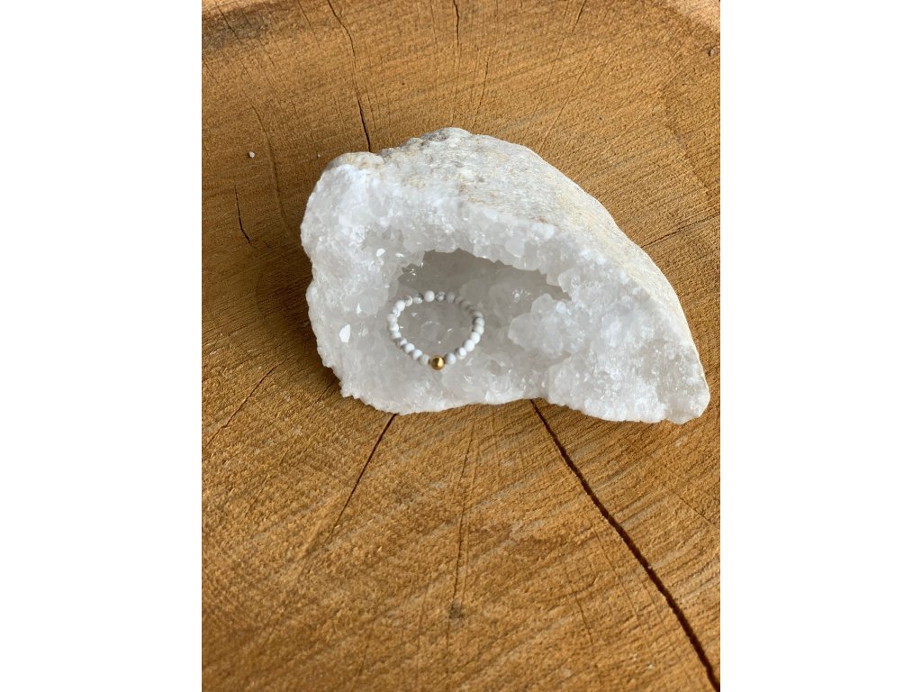 Doplňuje ho decentní zlatý korálek, který přináší do designu nádech luxusu a podtrhuje čistotu bílého howlitu. Prstýnek je navlečen na pružném lanku, takže se pohodlně nosí a snadno přizpůsobí prstu.