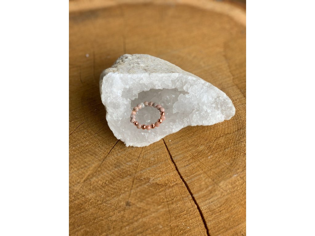 Ručně vyrobený prstýnek ve velikosti 52, složený z jemných korálků rodochrozitu a lesklého hematitu v odstínu rose gold. Elegantní kombinace dvou minerálů vytváří vizuálně harmonický a energeticky vyvážený šperk, který je ideální jak pro každodenní nošení, tak i jako osobní talisman.