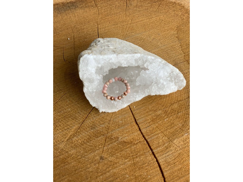 Prstýnek z rodochrozitu a hematitu v rose gold odstínu. Velikost 52. Jemné spojení ženské energie, lásky a vnitřní síly.