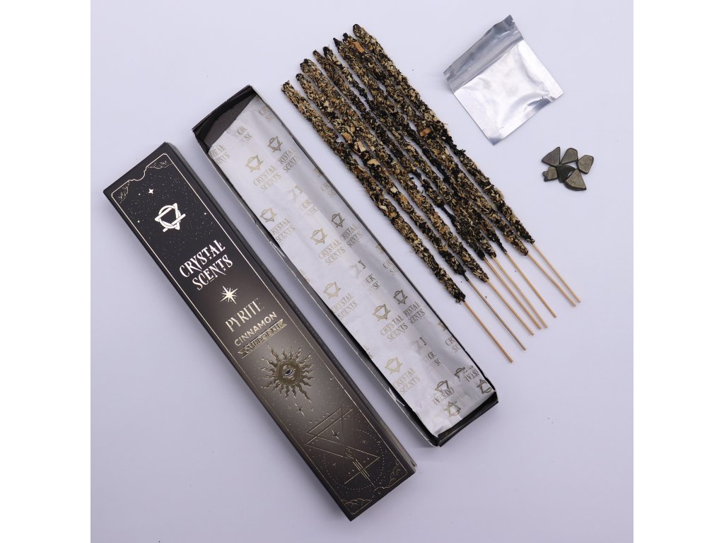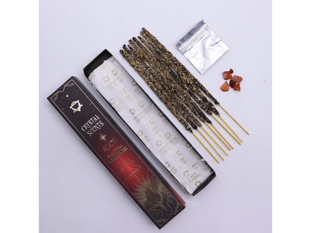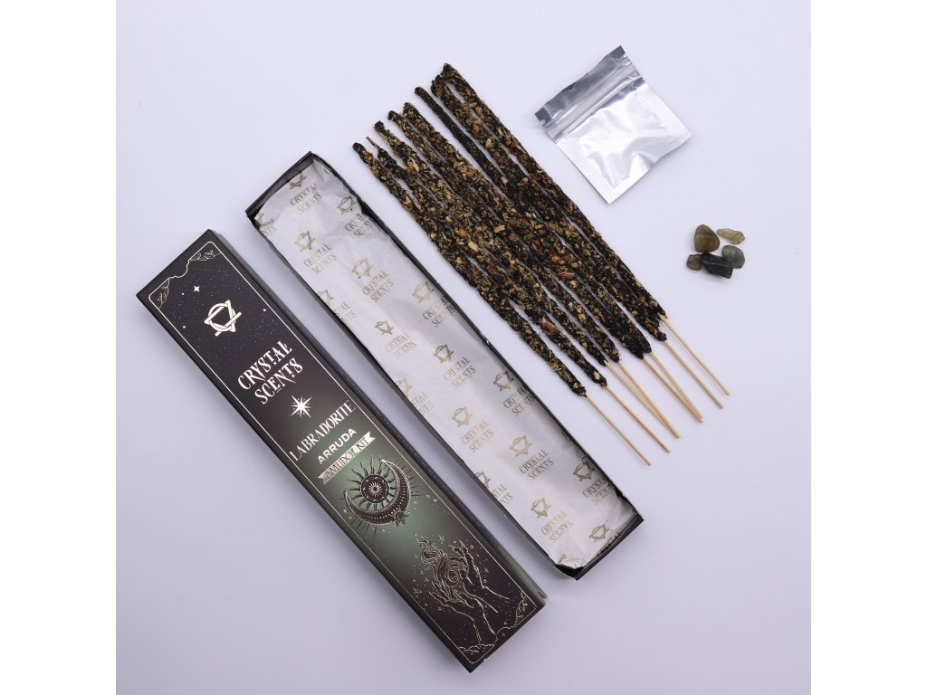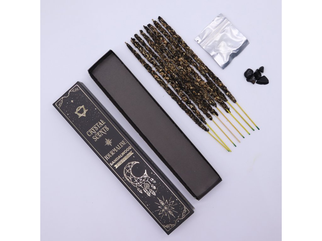 Každé balení obsahuje 10 ručně vyrobených tyčinek spárovaných s pravým krystalem a obálkou se vzkazem, což poskytuje promyšlenou prezentaci připravenou k darování. Od uzemňujícího tepla červeného achátu až po ochrannou energii turmalínu, každá vůně je navržena tak, aby podporovala meditaci, stanovení záměru, sezónní rituály a domácí atmosféru. Tato kolekce, zabalená do elegantního nebeského uměleckého díla, které zdůrazňuje jedinečnou energii každého krystalu, je ideální pro prodejní prezentace, wellness prostory nebo jako dárky.