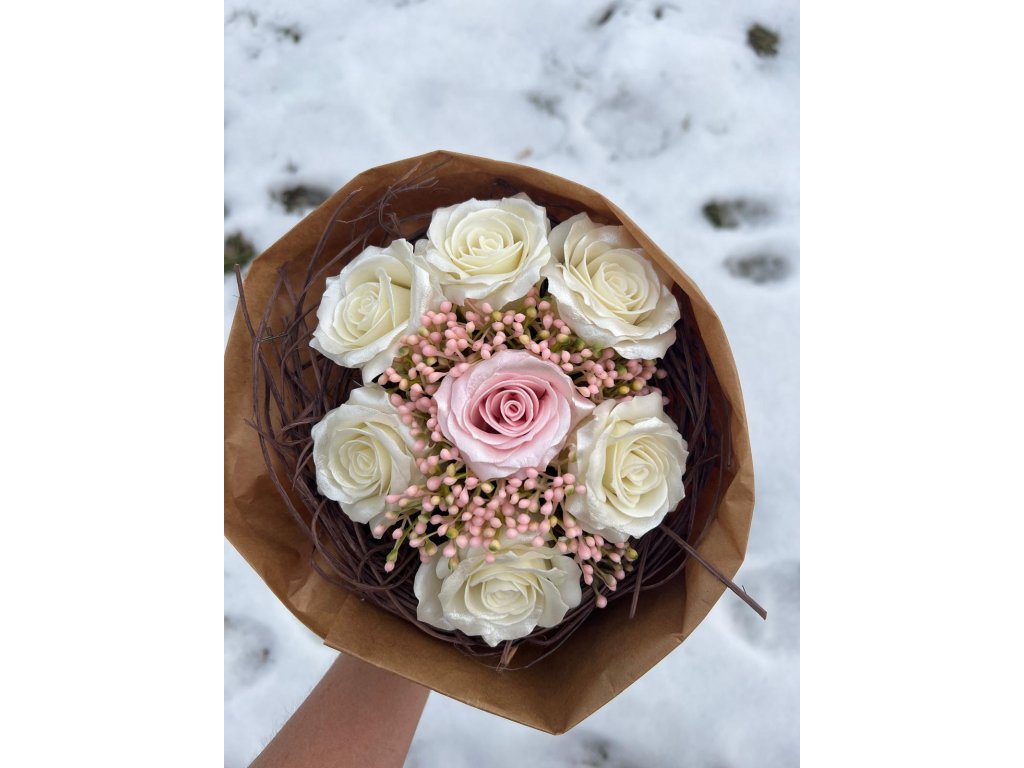Představujeme exkluzivní zimní kolekci dekorativních kytic, která vznikla jako spojení ruční práce, kvalitních materiálů a elegance inspirované zimní atmosférou. Každá kytice obsahuje precizně vytvořené růže z mýdlového papíru – materiálu, který svým vzhledem dokonale napodobuje skutečné okvětní lístky. Růže mají jemnou strukturu, přirozené tónování a lehký perleťový lesk, díky kterému vypadají opravdu výjimečně.