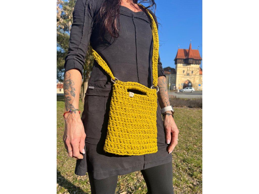 Ručně háčkovaná žlutá crossbody kabelka z pevné příze, která zaujme svou výraznou barvou a originální strukturou. Díky dlouhému popruhu ji můžeš pohodlně nosit přes rameno nebo jako crossbody kabelku. Stylový handmade doplněk, který oživí každý outfit.